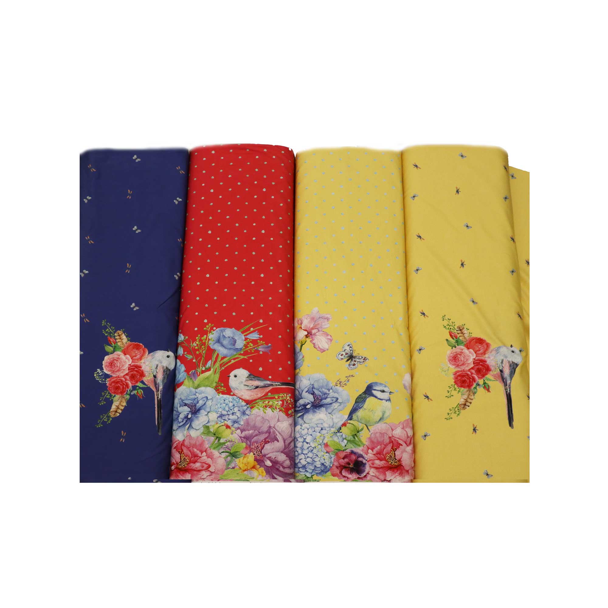 Tihaste ja lillekestega puuvillasegu kangas.