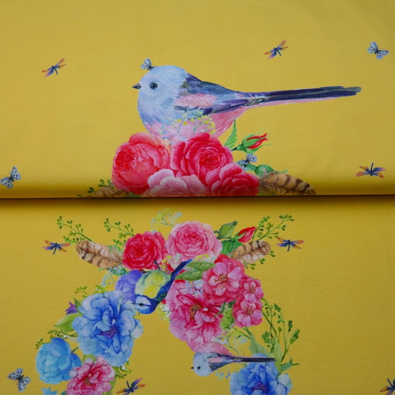 Kirju mustriga kollane trikookangas
